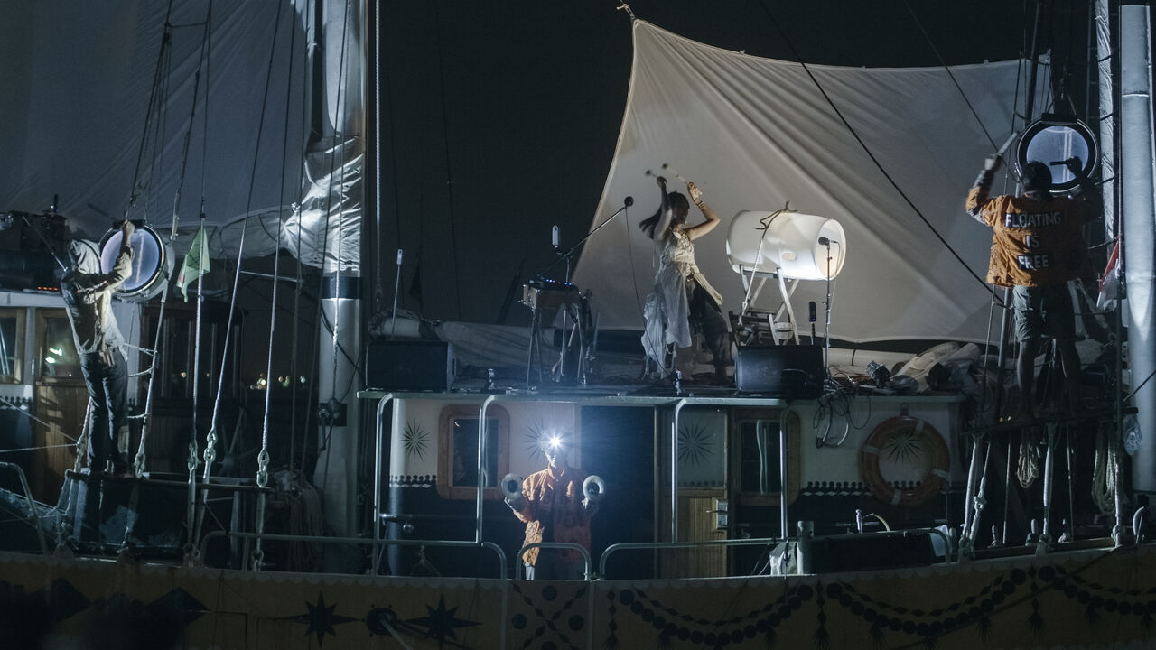 Arka Kinari is a multimedia performance staged from the deck of a classic sailing ship, using live music and cinematic visuals to imagine life after the carbon economy, resilience to climate change, and re-engagement with the last great commons — the sea. Subversive, immersive, and partially submerged, Arka Kinari sounds the alarm for ecological crisis and prefigures nomadic life in a porous and borderless future.