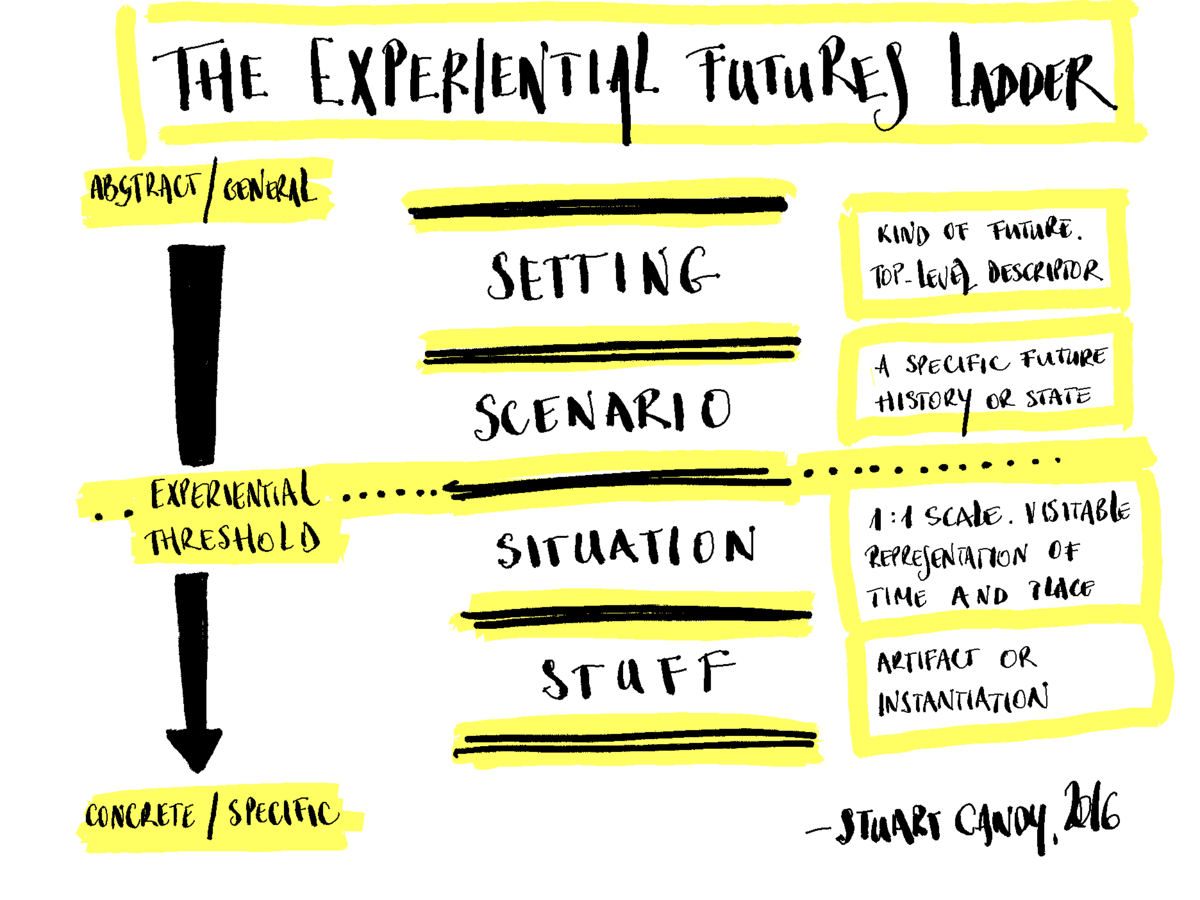 The design and staging of experiential scenarios is a political, practical and perceptual-level intervention. It is praxis oriented and more than a little messy; a tactical attempt to manipulate the quirks of the human information processing system, especially our evolved preference for the immediate and tangible over the remote and abstract, to give those quirks a better chance of operating in our collective long-term interest, rather than against it.Stuart Candy, The Futures of Everyday Life