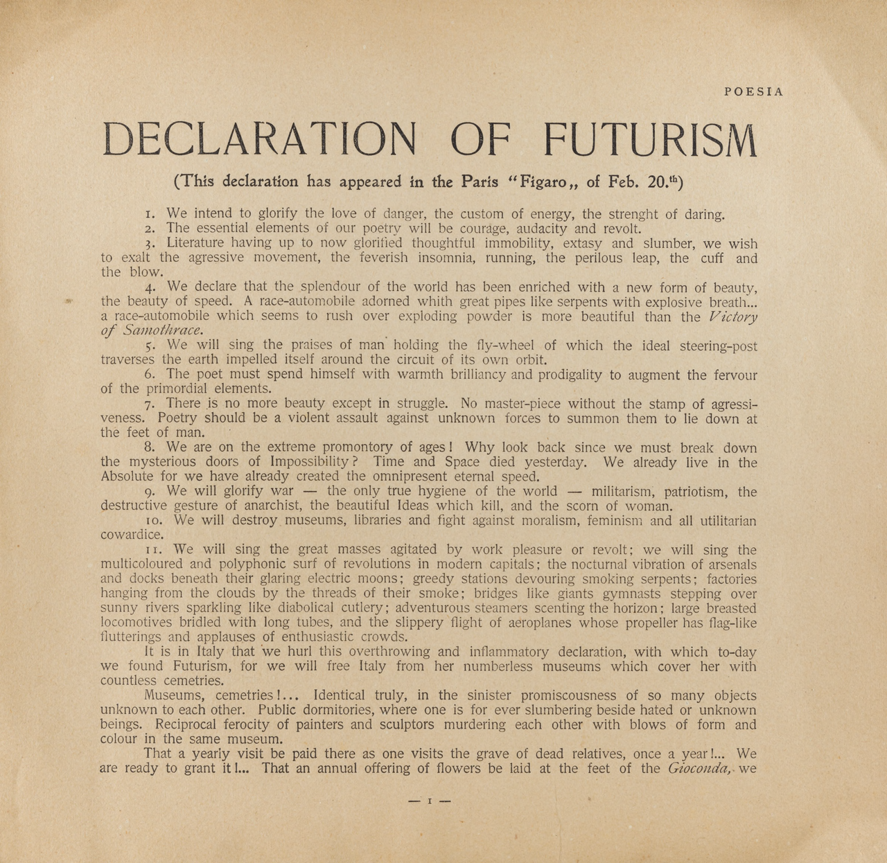 There is an old story of the birth of the avant-garde manifesto a century ago: macho Futurists shouting about torching libraries, flooding museums, bringing “the slap and the punch” back into art, crashing automobiles, celebrating war and scorning women, hurling semen at the stars. Up to now literature has exalted contemplative stillness, ecstasy, and sleep. We intend to exalt movement and aggression, feverish insomnia, the racer’s stride, the mortal leap, the slap and the punch.