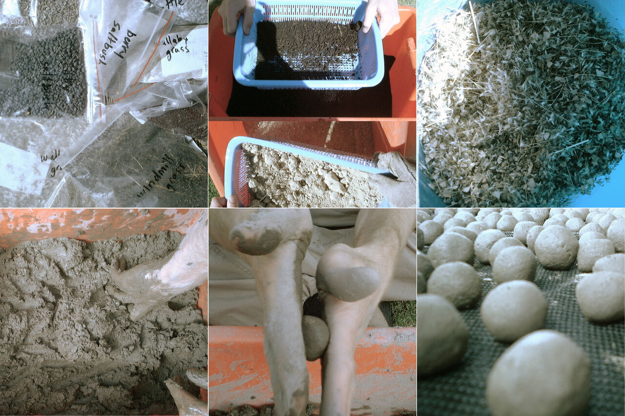 Coat the seeds with dry compost, then clay. Add water, a little bit at a time, until the mass is easily “kneadable”. Form small balls (1~2 cm) and leave them to dry for about 2 days. Spread in the city by throwing onto unused lots, parks, next to canals or rivers.