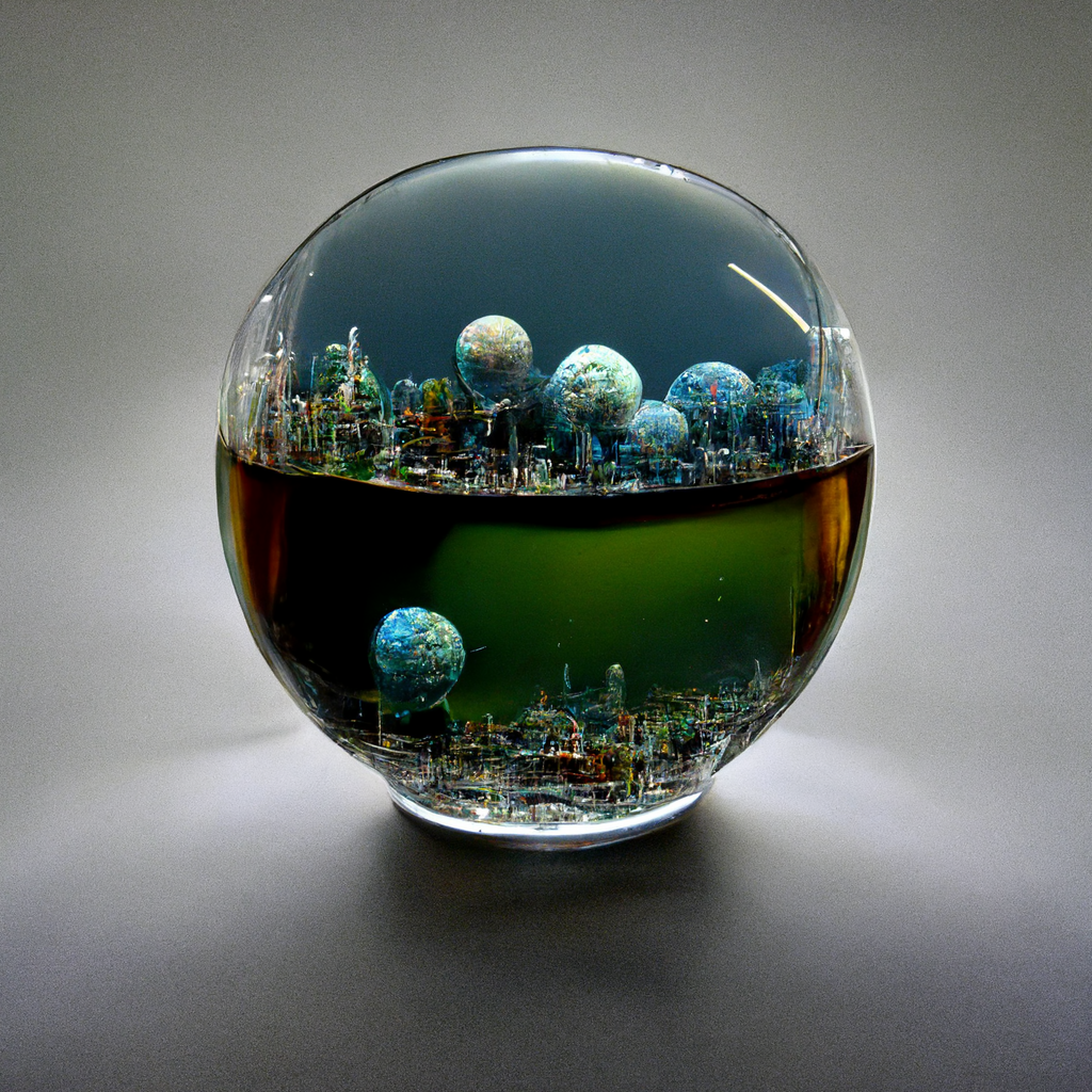 If you reduce your scale toLilliputian dimensions and enter through the bubble's liquid membrane, you'll soon find yourself looking up at the domed immensity of a vaulted sky with stars and constellations drifting across a milky borealis. Microscopic zooms reveal plumes that seem to mimic the shifting plates and tectonic drifts of our own planet in time lapse mode. Diaphanous swirls quote the movements of mists and cirrus clouds as they move across the surface of the earth – strange mirages brought into focus by the optical rumours that roam the bubbles surface. Here is a miniature world woven by a loom of prisms; a world of tiny cyclones and coriolis spirals. Having moved through the inflationary foam of your own imagination, you look upwards at coruscating trails to confirm the layered nebulae that spread across your field of vision. You have almost turned your imagination inside out. The mind – another universe inside a bubble – floats off disembodied into this scheme of visions and leaves the body weightless. Inner visions, like bubbles, pop or join. The mirrored sphere has become a model mirage. Its reflected space curves the entire world into a single point of view like Escher's famous drawing of a mirror sphere. The bubble melts the outer image of the world and returns it as another (i)mage as it wraps the landscape of the world into a single sphere.
